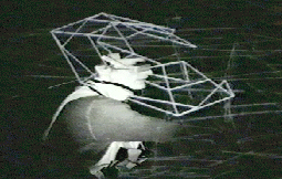 Navigation des Besuchers im Aktionsraum. Wenn der Besucher den Installationsraum betritt, wird er durch ein Ultraschallsensorsystem geortet. Seine Position wird in den virtuellen Raum übertragen, der damit mit dem Realraum interaktiv verbunden ist. Der Besucher bewegt sich in diesem völlig dunklen Aktionsraum mit Hilfe eines, vor einem Auge befestigten, kleinen Monitors (private eye), der über Funk mit dem Datenraum in Verbindung steht. Der Monitor liefert dem Besucher textliche Angaben zu seiner Orientierung im virtuellen Raum und weist ihm Richtungen zur Kontaktaufnahme mit den Klanggruppen zu. Diese abstrakte, sprachliche Beschreibung des virtuellen Raumes dient der ständigen Konfrontation der körperlichen Aktion des Besuchers mit seiner gleichzeitigen Präsenz im digitalisierten künstlichen Raum.